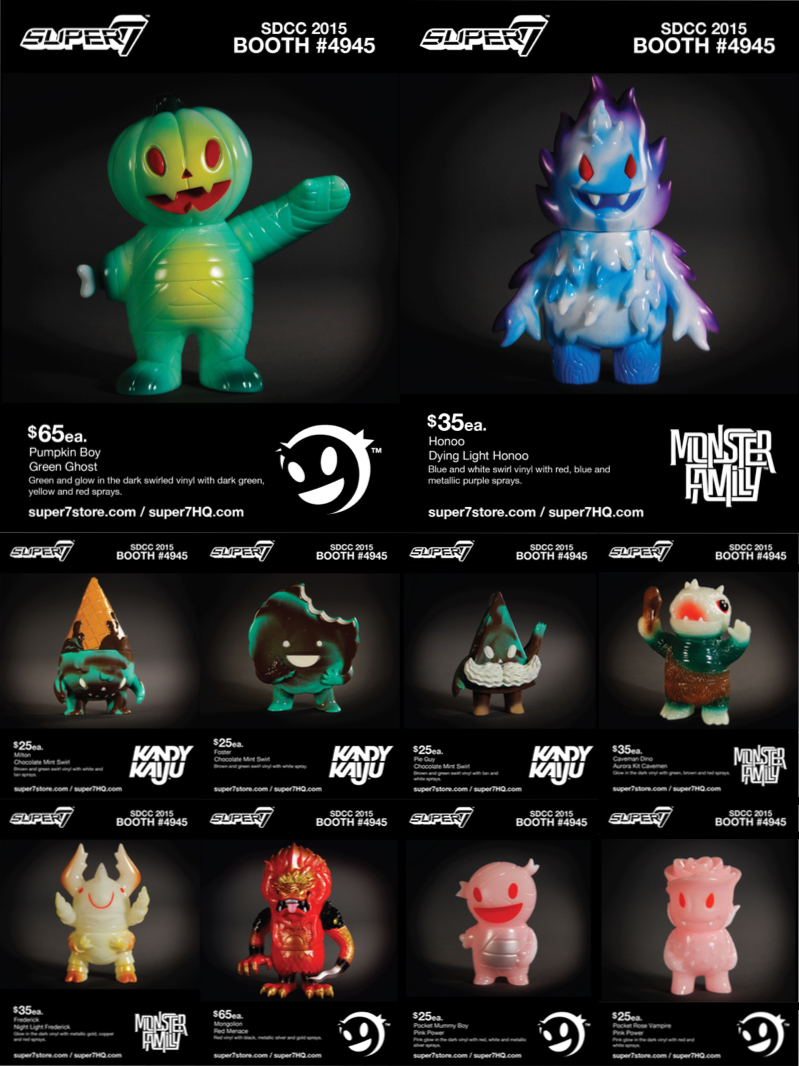 With San Diego Comic Con ’15 opening it’s doors in just a couple of weeks time, the guys over at Super7 have decided to reveal the horde of exclusive vinyl figures they’ll have up for grabs at the event! Featuring a total of 10 different pieces this time around, highlights include a trio of Kandy Kaiju in a “Chocolate Mint Swirl”, a “Pink Power” Pocket Mummy Boy and Rose Vampire, a “Green Ghost” Pumpkin Boy and a “Dying Light” Honoo. Click on the picture above for details on each figure and be sure to stay tuned for more SDCC exclusives from the Super7 camp soon!