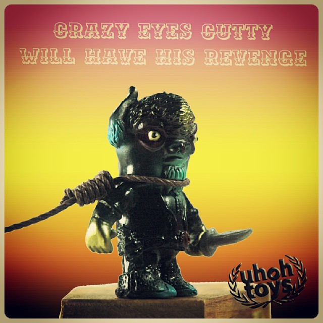 Aaron over at UhOh Toys is proud to reveal that his “Cutty” Errants mini figure is set to return this week as part of a special “Crazy Eyes” play set release! Featuring the little guy in what appears to be a black soft vinyl this time around, the adorable space bull has been treated to minimal teal and gold sprays, coming complete with a knife, cowboy hat, noose, wanted poster and miniature real wood coffin. Limited to just 3 sets, the “Crazy Eyes” Cutty will be up for grabs on the UhOh Toys store this Friday, July 3rd at 12pm Pacific time for an undisclosed sum…