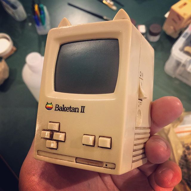 Originally teased here early last month, the as yet untitled vintage computer-style sofubi from Baketan has just been revealed in its first painted colorway! Heavily inspired by Apple’s iconic Macintosh II computer, the adorable slab of retro tech comes complete with vintage-style buttons, switches, cartridge slots and even – in a nod to previous Baketan releases – a pair of super-cute cats ears. Pictured here in what we hope to be the first painted run, the little guy has been produced in a cream soft vinyl with a subtle weathered yellow paint app complete with an authentic logo and font inspired by Apple’s classic ident. Whilst release details are still thin on the ground at present, we’ll be keeping our fingers crossed that the figure will see the light of day soon…
