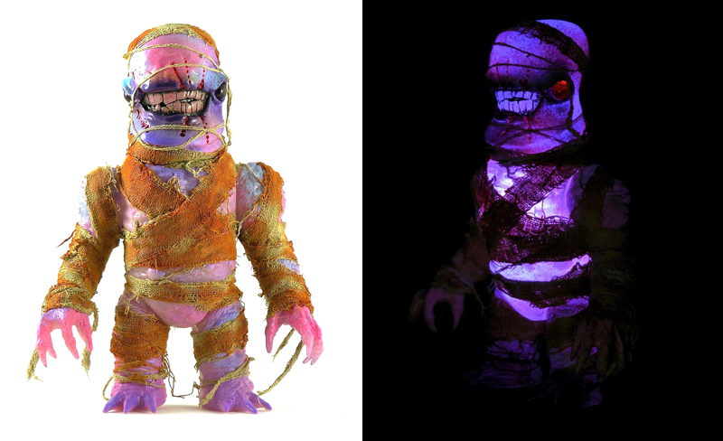 Next, we have the “Mummy Gnaw-X 1”. The latest custom to feature Plaseebo’s Gnaw-X head on top of the Skull Head Butt body, the 9″ tall figure again features red glass inset eyes and an internal motion LED unit, all coming wrapped in an authentic cloth bandage… On display at the event starting this Saturday, July 18th, pricing for both pieces is still to be confirmed…