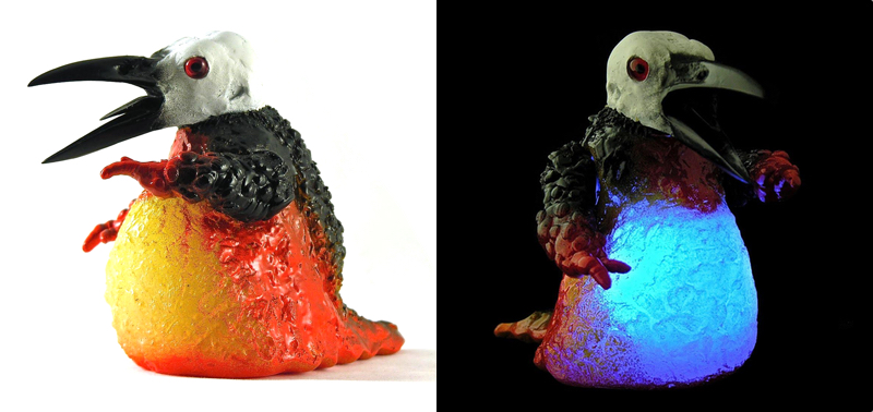 Bob Conge aka Plaseebo is proud to introduce to pieces that he’ll have on display at MOAH‘s upcoming “The Art of Toy” show this weekend! First up, we have the ingeniously titled “After Hieronymus Bosch” (top). A one of a kind custom that’s been hand cast by Plaseebo in resin, this ode to Bosch’s fantastical paint style comes with fitted with inset red eyes and an internal switched color-changing LED unit…