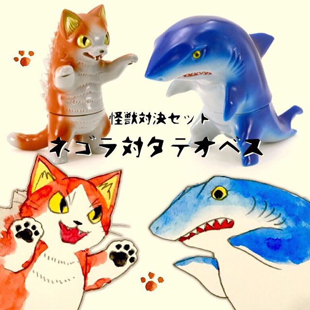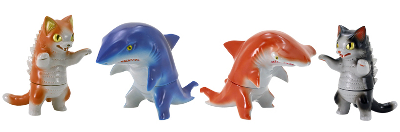 Konatsuya is very proud to reveal that she’s teamed up with Sunguts for the latest Monster Battle set! Featuring Konatsuya’s signature “Negora” figure alongside Sunguts’ awesome “Tateobesu” shark monster, the pair are due to be released in 2 different colorways – blue/brown and brown/black – both coming cast in a light grey soft vinyl and treated to gold, red, white and black detailing. Going on sale this Friday, July 18th at a number of Japanese retailers including One-Up, the “Negora Vs. Tateobesu” Monster Battle sets can be yours for just 5,400yen ($44) each. Whilst we’re still unsure as to whether the little guys will be available to overseas customers, we’re sure forwarding service M-World will be able to help out with any requests- interested parties can hit them up at m-world-service@dream.jp…