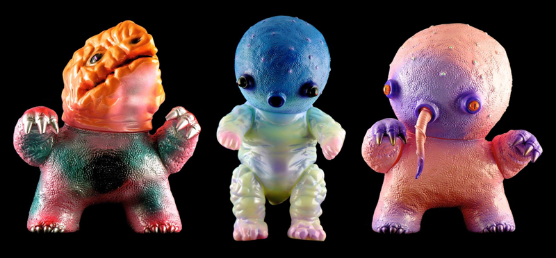 Plaseebo continues his ongoing team up with Gorgoloid‘s Barry Williams, proudly presenting a trifecta of “Night Gamer” one-off customs from the artist! First up, we have the awesome “Hawaiian Dino Gamer”. A 6″ tall mash-up of Plaseebo’s Night Gamer, an M1 Gorugosu head and a pair of resin cast hands, the beast has been treated to a number of classic Hawaiian-style sprays in orange, teal, silver and black… Next, we have the “Cotton Candy Night Gamer”. Standing at around 7″ tall, the soft vinyl figure has been decked out in soft pink and purple sprays, coming complete with resin hands and custom taxidermy eyes… Last, but by no means least, we have the impressive “Aurora Belly Night Gamer” (pictured middle). A mash-up utilising a Night Gamer head and a GID M1 Gorugosu body, the figure comes fitted with red glass eye inserts plus a number of motion activated LED units… Priced at $350, $400 and $700 respectively, the latest round of Gorgoloid Night Gamers will be touching down in the Plaseebo store this coming Friday, July 24th…
