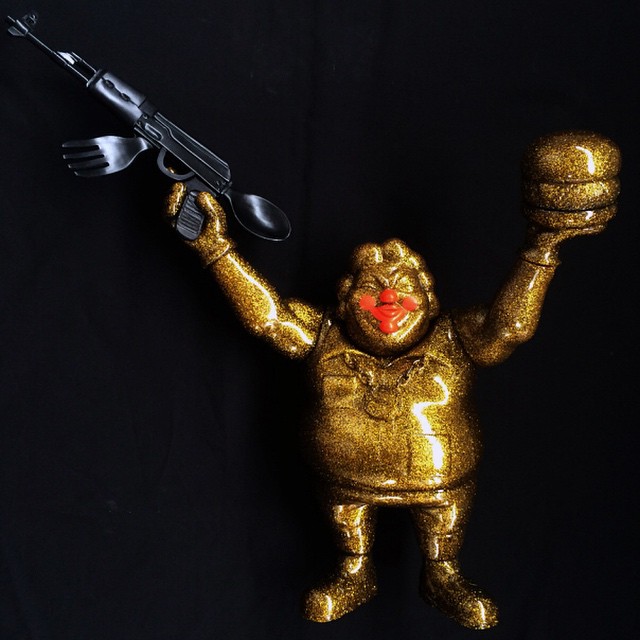 Originally teased here just a few days back, we can now reveal the latest “Evil Mc” colorway from Ron English and BlackBook Toy in-full, proudly presenting the “Hella Bling” edition! Based on the reoccurring character seen in many of English’s paintings, the sinister-looking fast food anti-mascot has been realised in 3D by the talented Chop over at Monster Farm, standing at well over 13″ tall and coming with an impressive 8 points of articulation. Produced in a gold glitter-infused vinyl with masked red sprays for the release – complete with detachable fast food gun and jumbo burger accessory – the figure will be making its first appearance at BlackBook Toy’s Wonderfestival booth (8-20-15) next Sunday, July 26th, with a limited supply touching down in their online store the same day at 11am Eastern time. Pricing is still to be decided, but we’re guessing the piece will set you back around $120 plus shipping…