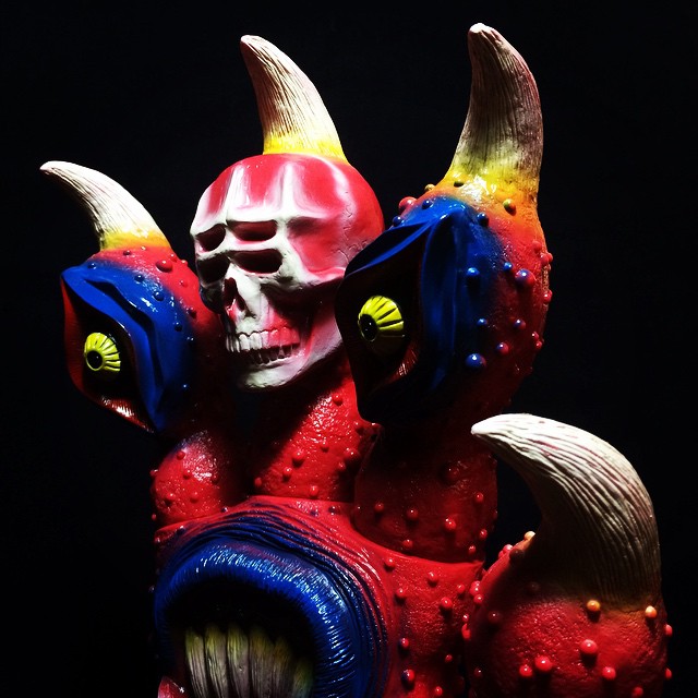 Terrible Whore has just revealed that his highly sought after F***king Four Fingers sofubi is set to receive its third colorway just in time for Wonderfestival Summer ’15 this weekend! Produced in a glossy red soft vinyl, the towering 10″ tall figure – a twisted homage to Kinnikuman’s Snegator Claw – has been treated to a mix of macabre ivory, yellow and metallic blue sprays, coming packed in a beautiful custom silkscreened drawstring bag. Going on sale at Terrible Whore’s WF booth (4-03-02) this Sunday, July 26th for an undisclosed sum, we’ll be keeping our fingers crossed that – as with previous releases – a few have been held back for an online lottery next week…