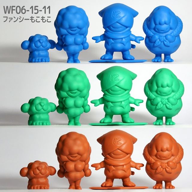 Japanese artist Chihiro Takigawa is proud to reveal that his “Fancy Fluffy” keshi series will be making its debut at Wonderfestival Summer ’15 this weekend! Featuring 3 sheep characters alongside what appears to be a shepherd, the wonderfully stylised figures come in at around 1″-2″ each. Produced in a mix of blue, green and orange soft resin for this first release, the Fancy Fluffy keshi will be up for grabs at Takigawa’s booth this Sunday, July 26th, each coming packed with matching Bikkuriman-style stickers for an undisclosed sum… Here’s hoping the little guys get some sort of overseas release soon!