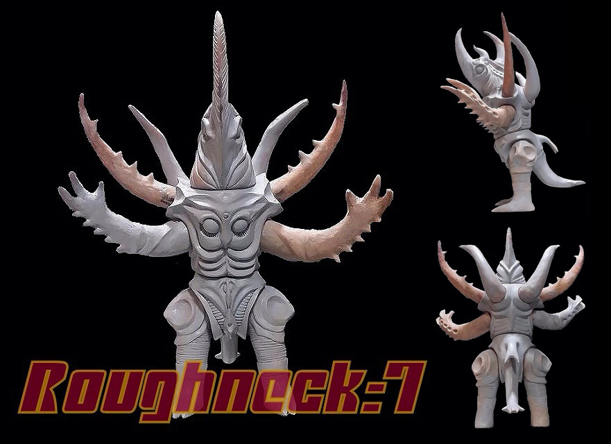 Continuing their renaissance in classically styled kaiju, the guys over at Roughneck:7 have just unveiled the latest figure to join their ever-growing line-up of city destroying beasts! Referred to as simply “Him” for the time being, the impressive figure dwarfs the previously released Demushiron, Yabkyrie and Jabara at around 14″ tall, coming complete with 9 points of articulation that can be manipulated to transform the figure into a neat “tank mode” (check it out here). Due to head into production soon, we’ll be keeping our fingers crossed that “He” makes his debut in soft vinyl at Superfestival in September…