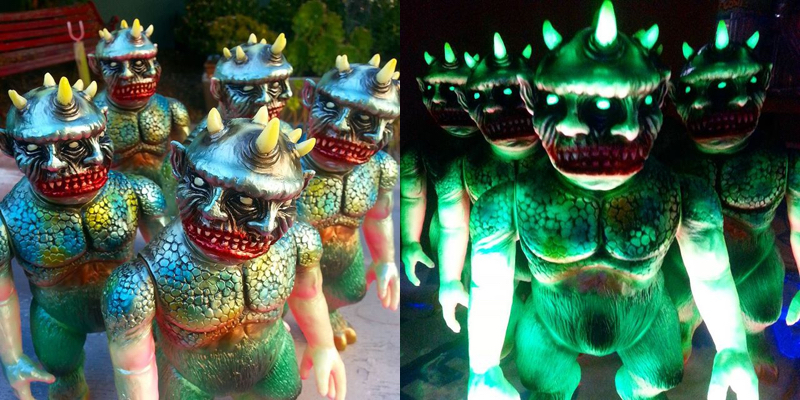 Fresh from this week’s “Blank Black” release (check it here), Splurrt/Secretoy’s hugely popular Cinema Monster sofubi is set to return as a painted micro-run courtesy of Paul Kaiju soon! Heavily inspired by the golden age of monster flicks – including both Ray Harryhausen’s classic Cyclops and the 2-headed “Galligantua” that graces the iconic cover of 1968′s Famous Monsters of Filmland yearbook – the lumbering 10″ tall beast has been produced in a glow-in-the-dark soft vinyl this time around, coming with layers of metallic sprays and hand brushed detailing courts of PK. Whilst we don’t have any specific release details to announce at present, we’ve been told that these will be available via lottery sales through the PK site over the coming weeks. Keep track of the artist’s Instagram feed here for more info soon!