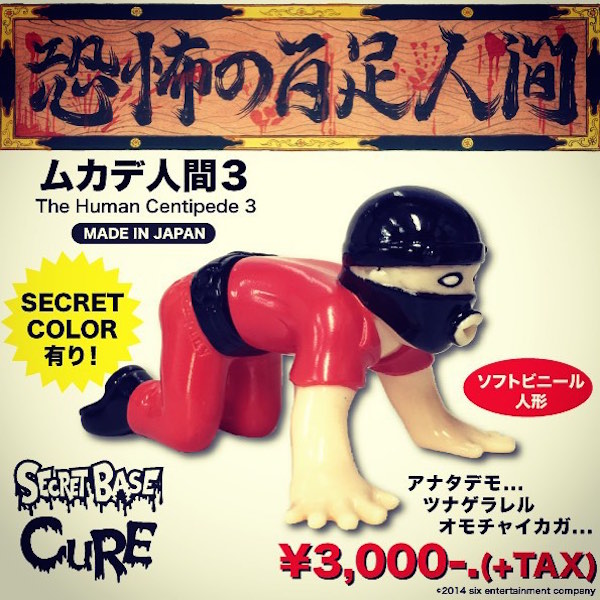 Yep, strangely yet more Human Centipede related toy news today, as Secret Base and Cure proudly reveal their collaborative figure based on the recent “Third Sequence” film! Depicting one of the many, many unfortunate prisoners that make up the 250+ strong centipede line depicted in the depraved flick, the little guy – positioned in the classic ass to mouth pose – has been produced in what appears to be a flesh colored soft vinyl, coming with a mix of red and black sprays. Touching down in the Secret Base store later this week to coincide with the film’s release in Japanese theatres, the figure will be available “blind bag” with a number of different chase variants on offer for just 3,000yen ($24) a piece…