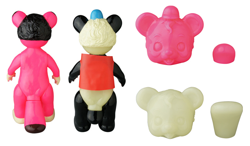 With the past 2 months seeing Medicom Toy re-release Anraku Ansaku’s legendary “Zoromederu” and “Gogamejira”, the Japanese toy giant is planning to go one step further with their next collaboration, unleashing all-new figure “Pokopon the Raccoon” (たぬきのぽこぽん) and variant “Panda/PanFutoshi Ron” (パンダのぱん太ロン). Beautifully sculpted in classic vintage sofubi proportions, the adorable duo share the same general body and shape, differentiated by Pokopon’s longer tail and Ron’s cap and vinyl waist coat. Standing at just under 10″ tall and featuring 6 points of articulation, the pair have been produced in what appears to be pink and GID soft vinyl for their first outing, coming complete with matching masked black, cream and blue sprays. Going on sale via open preorder through the Medicom Toy store starting Thursday, September 24th, both have been priced at just 10,800yen ($89) each plus shipping. But that’s not all! As an added buying incentive, anyone who purchases both figures will also receive unpainted heads and tails of both Pokopon and Ron… Time to start saving!