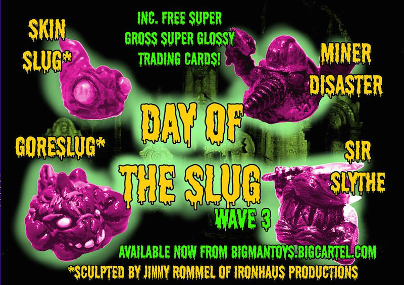 Our good friend Lee Burbridge over at Bigmantoys is proud to reveal that the third wave of “Day of the Slug” minis have just touched down online! Heavily inspired by Tim Clarke’s Mini Boglins, the 1″-1.5″ tall rubber figures have been jointly designed and sculpted by Lee and guest artist Jimmy Rommel of Ironhaus Pro. Releasing across 4 super-collectible waves of 4 figures a year – that’s a total of 16 in 2015! – this round features the pictured Skin Slug and Gore Slug from Jimmy alongside Miner Disaster and Sir Slythe from Lee. Currently up for grabs through the Bigmantoys store right here, the whole set are available in both resin or rubber for just $30 plus shipping…