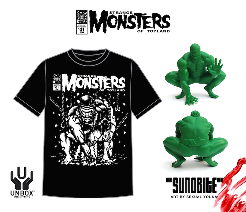 Hot on the heals of “Tug-O-War”, “Shogu-Nasty” and “Necrolossus” (check all 3 here), we’re proud to reveal that the fourth release in Unbox Industries‘ “Strange Monsters” mini figures line – the “Sunobite” from our very own Tru:Tek – will finally be up for grabs next week! A nightmarish mix of both rikishi (sumo) and Hellraiser’s most fearsome Cenobite – the Chatterer – the fearsome beast was designed by Tru:Tek and rendered by Unbox’s digital team, coming in at an oversized 2.5″ tall and the same wide. Produced by Unbox in a unique deep green, rubber-like soft vinyl for it’s first release, the Sunobite is set to come with a vinyl sticker and custom header card for just $15 plus shipping…