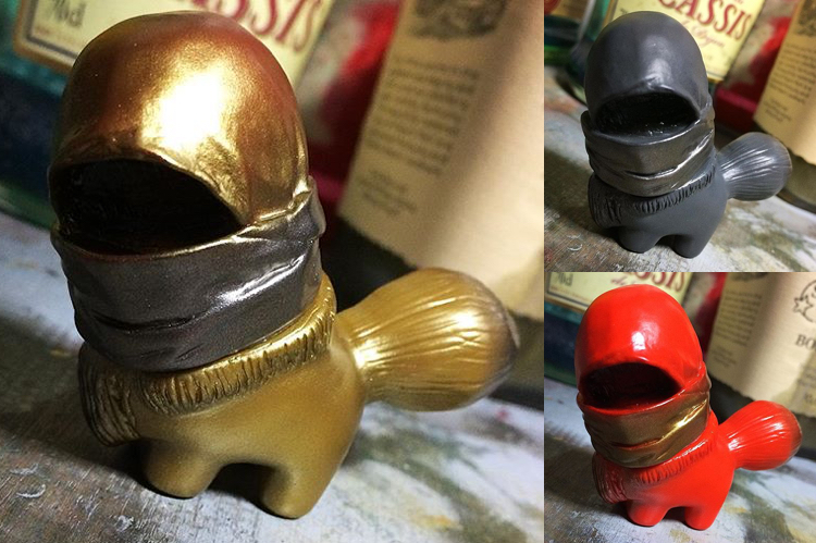Science Patrol is the latest artist to interpret the infamous “Human Face Dog” of Japanese urban legend, proudly presenting the Hooded Jinmenken sofubi minis! A ingenious mash-up of SP’s Trunkie and Elemental Mage figures, the super-cute canines appear to have been cast in a black soft vinyl for their first release, coming in a choice of red, grey and gold colorways. Debuting at Superfestival 69 on Sunday, September 27th, here’s hoping a few make it online soon after…