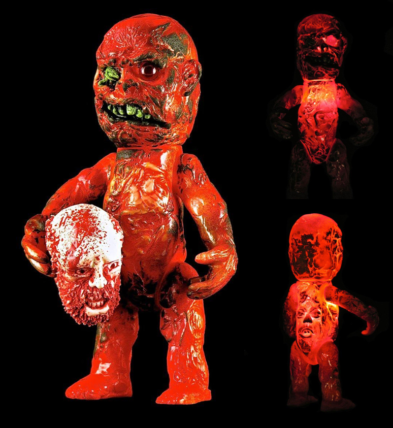 Bob Conge aka Plaseebo is proud to reveal that he’ll be unleashing a number of one-off customs over the next few months based on Kearjun‘s highly popular YouZha vinyl figure, the first coming in the form of the “Dante’s Inferno” piece you see above! Standing at around 8″ tall and featuring 5 points of articulation, the hard vinyl figure has been treated to a unique paint app that resembles burning flesh, coming complete with a motion activated LED unit and a hand cast decapitated resin head accessory. Up for sale in the Plaseebo webstore this coming Friday, September 25th, pricing for the figure is still to be confirmed…