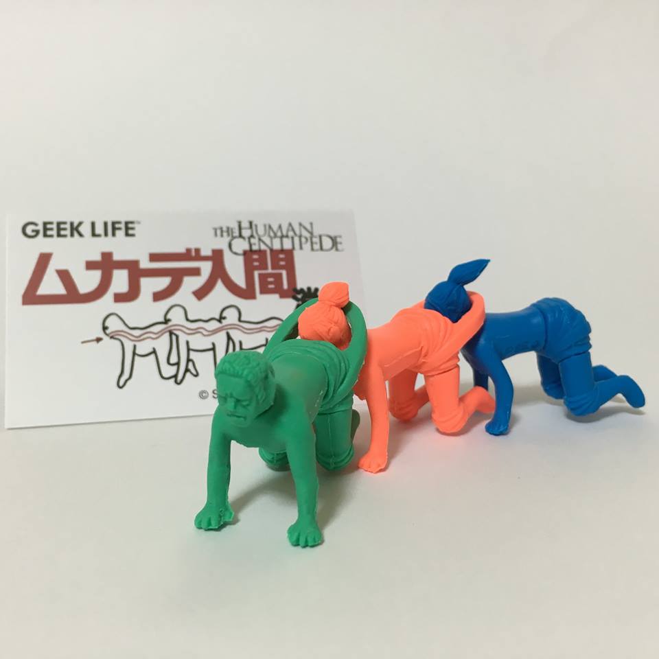 With the first wave having sold out instantly last month, the guys over at Geek Life are proud to reveal that their officially licensed Human Centipede keshi is returning this week with the final 3 figures in the series! Featuring the lead atagonists from the first film – Jenny, Lindsay and Katsuro – each has been sculpted by Kenth Toy Works at around 1.5″ tall, featuring ingenius interlocking harnesses so that the trio can be displayed as the film-accurate “centipede”. Once again produced in a selection of flesh, blue, green and orange rubber, the figures are due to be sold separately for just 2,000yen each plus shipping. Look out for them in the Geek Life store this Friday, October 2nd at Noon Japan time…