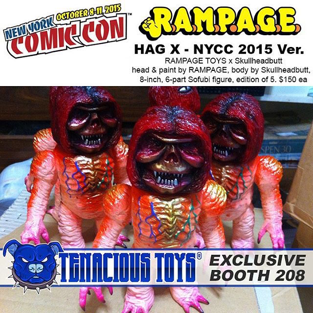 Whilst Rampage Toys‘ Jon Malmstedt sadly won’t be attending NYCC this year, the Japan-based sofubi artist had revealed that he’ll have a very special batch of Hag-X sofubi up for grabs through the Tenacious Toys collective! Standing at around 8″ tall and featuring 5 points of articulation, the co-Rampage/Skull Head Butt produced figure comes with the standard b-movie inspired “X” body and Rampage’s new “Hag Ball” as a head. Cast in what appears to be a red soft vinyl and treated to numerous flat and metallic sprays, the limited run of just 5 figures will be available at the Tenacious Toys booth (#208) starting next Thursday, October 8th for just $150 a piece…