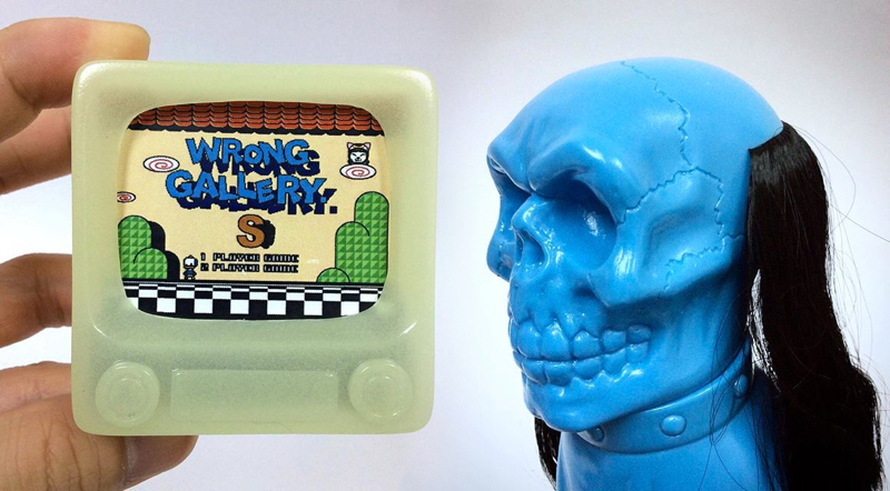 Awesome Toy has just announced that they’ll be teaming up with Wrong Gallery for the release of 2 exclusives at Taipei Toy Festival ’15 this weekend! First up, we have the return of the “Awesome TV”. Standing at around 3″ cubed, the DIY/custom orientated figure has been produced in a GID soft vinyl this time around, coming complete with 2 alternate “screens”; the original, They Live-inspired “OBEY” and an 8-bit NES-style design (pictured) from Taiwan artist SHON. Limited to just 20 pieces, these will be up for grabs at Wrong’s booth for just NTD500 ($15) each… Next, we have the latest version of Awesome Toy’s newest creation, the “Skull Jinmenken”. Standing at around 9″ tall and featuring articulation in the neck, the super-creepy figure has been produced in an unpainted blue soft vinyl replete with black hand threaded hair. Again, limited to just 20 pieces, expect to see the Skull Jinmenkens alongside the Awesome TV starting Friday, October 9th for NTD3000 ($92) each…