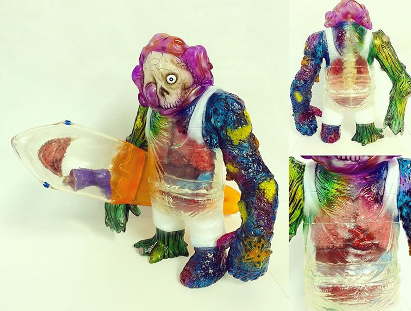 Kenth Toy Works are proud to reveal that their collaboration with SIX F – Naminori Kaijin Oron – will be featuring as a one-off custom in Clutter Gallery‘s “Nihonsei” (Made in Japan) group show later this month! Standing at a lofty 8.6″ tall with a 10″ sharkboard accessory, the driftwood and coral infused surfer dude has been produced in a clear soft vinyl this time around, coming with hand cast resin guts, brushed detailing and a selection of semi-translucent sprays over a black rub base. Up for grabs at the show’s opening on Saturday, November 14th, pricing for the figure is still to be confirmed… Look out for more Nihonsei reveals as we get closer to the event over the next couple of weeks!