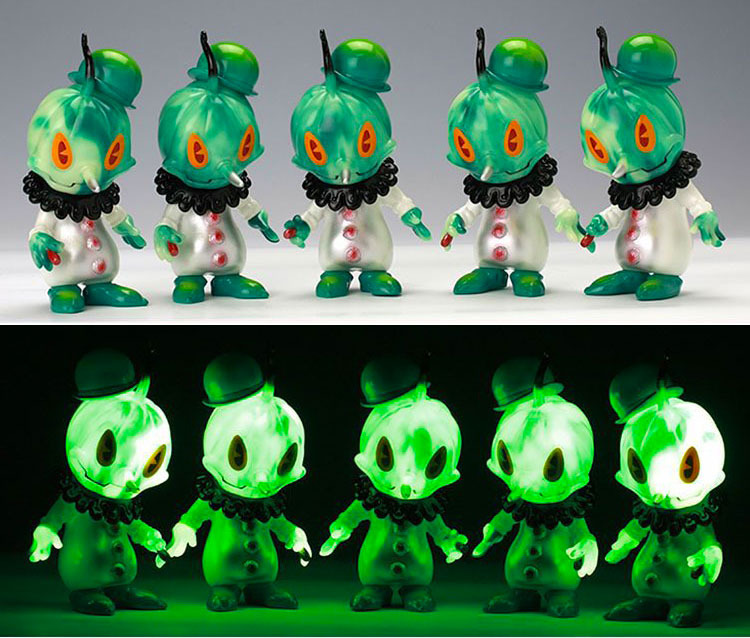 Brandt Peters over at Circus Posterus has just announced that his Stingy Jack sofubi will be returning this week in a gorgeous new “Swirl” colorway! Standing at around 6″ tall and featuring 2 points of articulation, the bowler hat wearing jack’o lantern has been produced in a mesmerising swirled green and GID soft vinyl this time around, replete with black, pearl, orange and red masked sprays. Limited to an edition of 50 this time around, 25 will be making their way into the Circus Posterus store for American and Canadian customers this Saturday, November 14th, coming in at just $95 each plus shipping, whilst the remaining 25 will be available worldwide through Tomenosuke soon… Want to see the figure in the flesh before purchasing? Then you’ll be glad to know that a very limited number will be held back for sale at Stranger Factory’s DCon ’15 booth next Saturday, Novmber 21st!