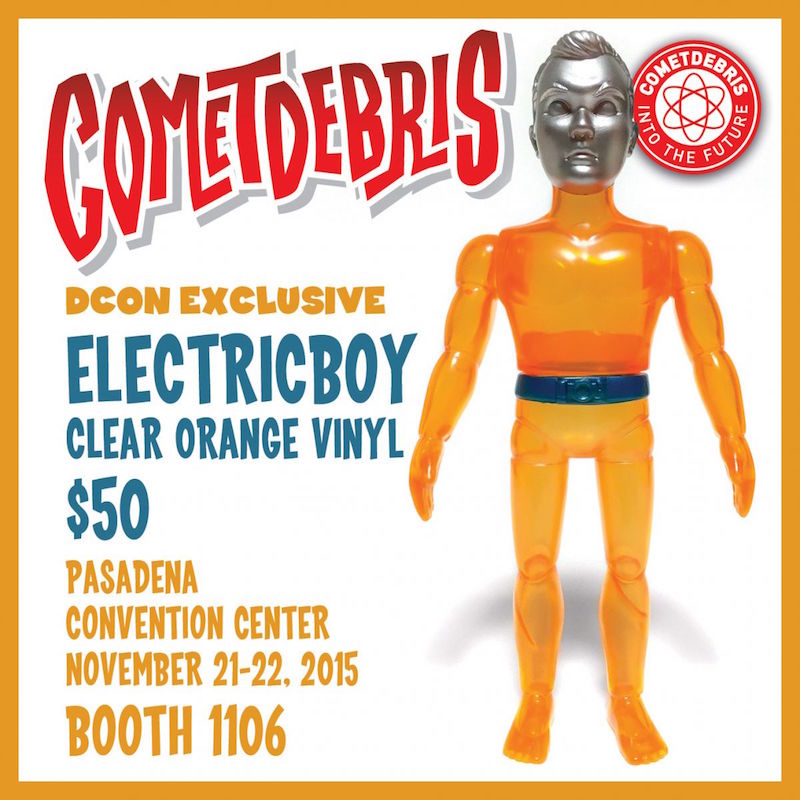 Koji Harmon over at Comet Debris has just unveiled the second exclusive he’ll be bringing along to Designer Con ’15 next week, the “Clear Orange” Electric Boy! Standing at around 5″ tall and featuring articulation in the waist and shoulders, the little guy has been produced in a clear orange soft vinyl inspired by Takara’s time traveling Micronauts, coming with an authentic chromed silver head and blue belt. Going on sale at the Comet Debris booth (#1106) starting Saturday, November 21st, the “Clear Orange” Electric Boy has been priced at just $50… Look out for more Comet Debris DCon exclusives over the next few days!