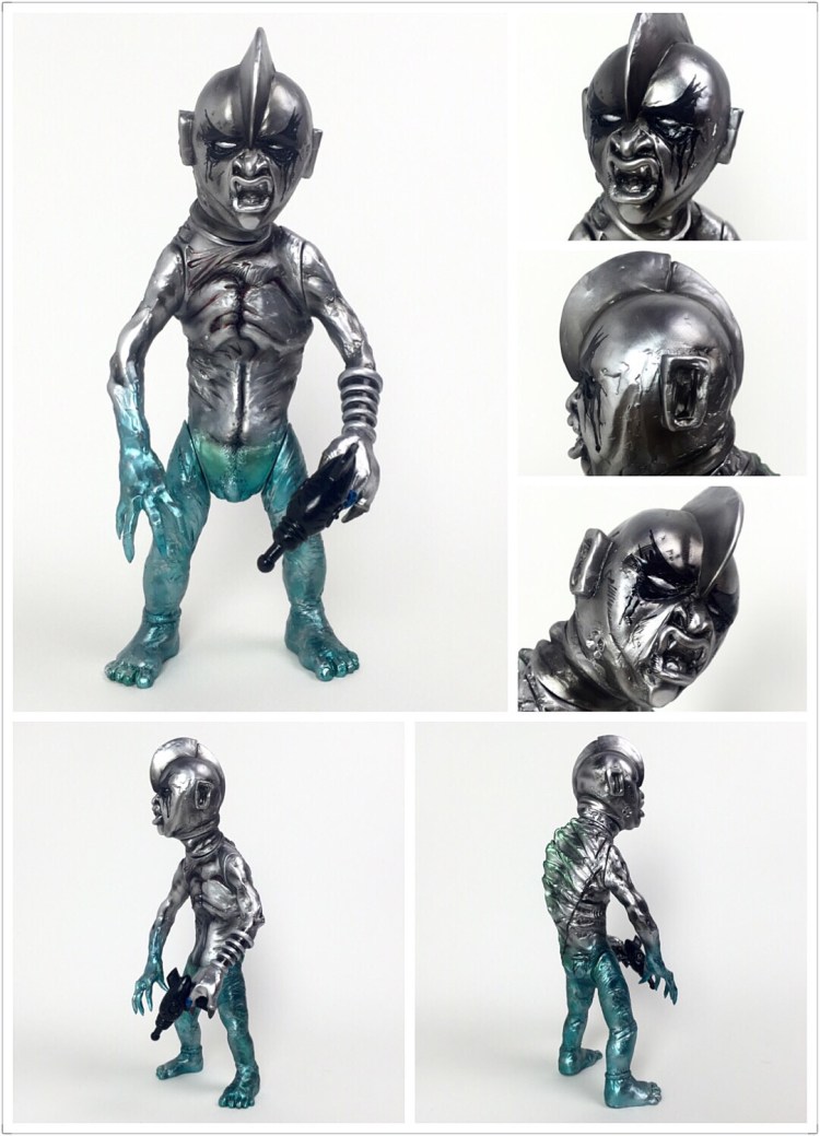 Having seen a number of super-limited artists runs over the past couple of months, PLT Toy’s Ultra Bastard finally sees its first official paint run this week! Standing at an impressive 12″ tall with 8 points of articulation, the evil looking beast has been produced by Unbox in a grey soft vinyl this time around, coming with a mix of white, green, blue and burgundy sprays with a matching ray gun. Limited to just 4 pieces priced at $220 each, anyone interested in bagging one is going to need to fire over their details to plttoys@foxmail.com before Friday, July 8th… But that’s not all! Joining the standard run, PLT will also be offering up a special “Death Metal” one-off too. Once again cast in grey vinyl, this one has been treated to silver sprays and black hand painted detailing. Priced at $250, the “Black Metal” Ultra Bastard is currently available through the same email system… Good luck to all who enter!