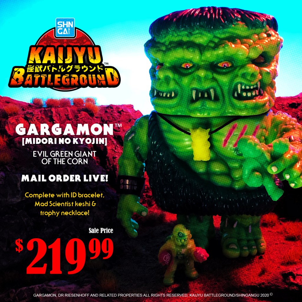 “The lead protagonist of Kaijyu Battleground, Gargamon is the result of increasingly warped biological experiments at the hands of the mad scientist, Dr Riesenhoff. Harvested from a radioactive human heart scavenged after the fallout of World War 3, the mutated organ quickly developed a mind of its own, sprouting arms, legs and three monstrous faces; each equipped with its own unique personality, powers and special abilities. Through years of intense teaching and training, the doctor has managed to transform the savage beast into a kaijyu killing machine, offering the few remaining humans their only real ally in the New World”