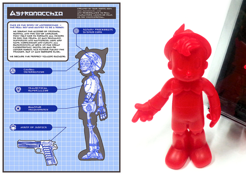 Dave Bondi is the latest artist to be announced in DKE Toys‘ exclusive SDCC line-up, bringing with him his latest resin creation, Astronocchio! A hilarious mash-up of Disney’s Pinocchio and Tezuka’s Astroboy, the originally sculpted figure stands at around 5″ tall, coming hand cast by the artist in a bright “retro” red resin with black hand gun accessory. Limited to an edition of just 25, each Astronocchio is packed on a blister card with vintage styled cut-out illustrations on the back. Priced at $65 a piece, the figures will be up for grabs at the DKE Toys SDCC booth (#5045) when the doors open on July 23rd…