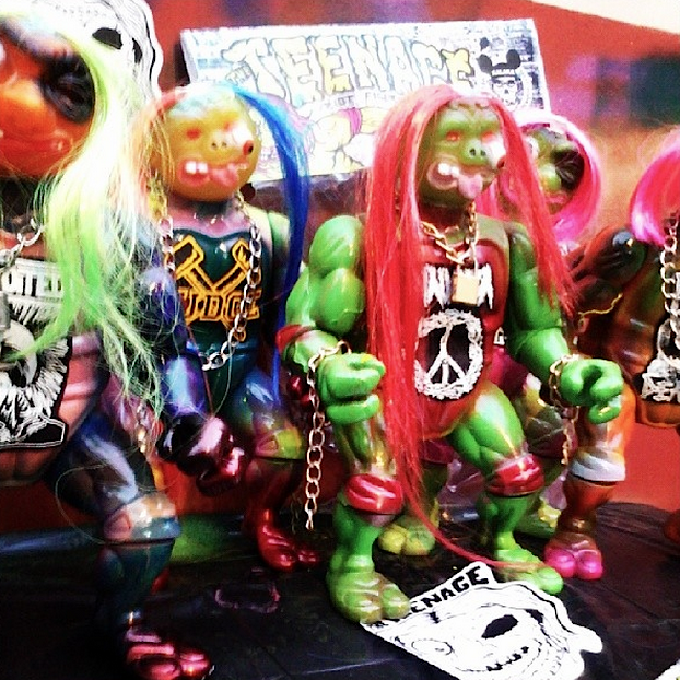 Originally featured here a couple of weeks back, it would appear that Matias over at Kalaka Toys has been working on a whole army of new Teenage Riot Figures for a fully fledged release soon! Loving tributes to both 80′s/90′s toy culture and neo-kaiju, the crazy looking custom figures have been fashioned from 14″ KO TMNTs and bootleg Madballs, complete with Nag-style locks, lashings of neon sprays, hand painted chest pieces, plus real metal neck chains. Due to go on sale at the soon to be opened Kalaka Toys store, keep a close eye on the artist’s IG feed here for exact release details soon…