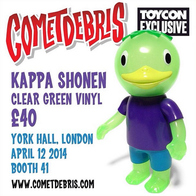 Following our look at the the “Early Bird” edition Sametan earlier in the week, Koji Harmon over at Comet Debris has just revealed another 2 exclusives that’ll be up for grabs at ToyCon UK next Saturday, April 12th! First up we have the return of Kappa Shonen… As previously teased, the 5″ tall figure has been cast up in a clear green this time around, coming with masked purple, blue, green, yellow, white and black sprays. Edition size on the piece is still to be revealed, but we can confirm they’ll be up for grabs at booth #41 for £40 each…