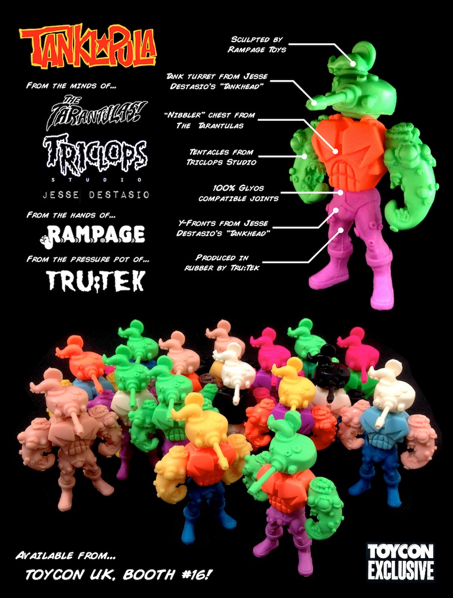 Joining the slew of exclusive kaiju, sofubi and keshi that’ll be up for grabs at the Rampage Toys x Disarticulators ToyCon UK booth next Saturday, our very own Tru:Tek is proud to reveal the resurrection of one of the craziest ever resin figures in keshi form… the mighty Tanklopula! The brainchild of Triclops, Jesse Destasio and The Tarantulas, the Rampage sculpted mini figure features signature elements from all 3 artists, including tentacles, a Nibbler chest piece and Tankhead turret- all coming fitted with fully interchangeable, 100% Glyos compatible joints. Originally making a very limited appearance back in 2011, the latest (and most likely final) run has been produced in a urethane rubber courtesy of Tru:Tek, with the batch of 15 each coming in a special one-off colorway inspired by a wide variety of 80s and 90s pop culture. Touching down exclusively at the Rampage/DA booth (#16) come opening time at 9am, Tanklopula has been priced at £35 a piece. Stay tuned for details of online sales, plus AP releases from both Destasio and Triclops soon!