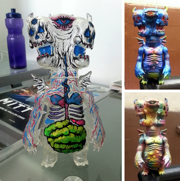 Sidestepping his usual micro-run approach, Frank Mysterio has just unleashed a batch of 3 one-off 666 Anticristo customs in his store! Featuring a “Gold Mix” and “Blue Glitter Metallic” that have been painted in a similar kaiju inspired style as previous releases, the real standout piece has got to be “Skin Bones Clear”, coming cast in a transparent soft vinyl, complete with an anatomical paint job in Mysterio’s signature mix of inked lines and blocked neon colours. Priced at $100, with both “Gold Mix” and “Blue Glitter Metallic” coming in at just $75 each, the trio can be found alongside a number of other customs in the Frank Mysterio store right here…