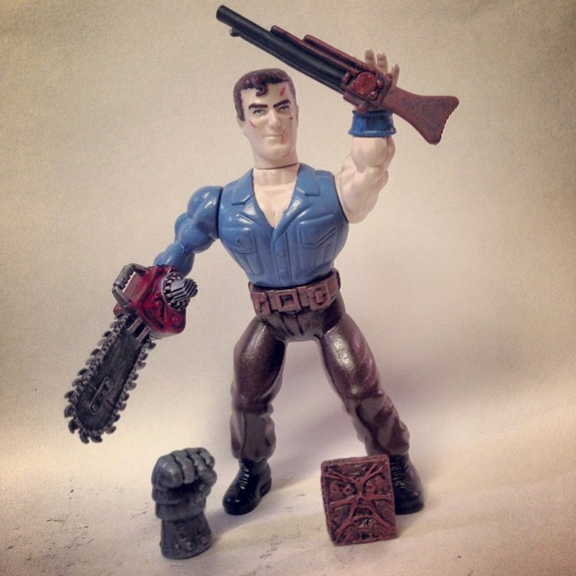 Taking his celebration of this week’s Ash Wednesday quite literally, Brandon Barker over at ManOrMonster? Studios has readied a very special figure for the occasion… the one and only Ash from cult classic Evil Dead! Kit-bashed and re-sculpted from a huge selection of vintage 5.5’s, the hand cast and painted resin action figure comes loaded with features and extras, including the standard WoW compatible neo-mag articulation, interchangeable chainsaw AND gauntlet arms from both Evil Dead 2 and Army of Darkness, a mountable boomstick, plus the source of all Ash’s problems, the Necronomicon itself! Limited to an edition of just 6 figures (plus one “Gory” variant!), the figure will be touching down in the MoM? store this Wednesday, March 5th for around $80 plus shipping. Keep track of the MoM? IG feed here for an exact release time…