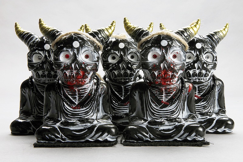 Following last week’s teaser, Lulubell are proud to reveal their exclusive of Devilboy’s Alavaka in full… presenting the Black 5! Limited to just 5 pieces, Lulubell’s offering has been cast in black soft vinyl with black rub, coming complete with a black bead mala and 5 red centre beads to signify the brotherhood. Featuring 2 high priests (chases) that have crazed red crystal eyes, rough sewn headbands and blood splattered mouths, the remaining 3 have been given flat black and shimmering black crystal eyes. Packaged with their very own prayer mat, the Black 5 will be touching down in the Lulubell store on Saturday, August 10th at 3.33pm EST for just $60 each…