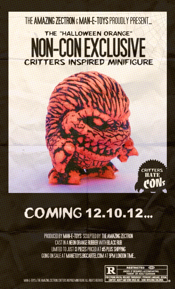 Our very own Tru:Tek has once agin teamed up with the Amazing Zectron for the latest batch of “Critters inspired” mini figures… the Halloween Orange “Non-Con” Exclusives! Whilst we’d have loved to send a batch of the mischevious little creatures to NYCC this week, there was unfortunately no one willing to take on such a big and dangerous task… so we’ve decided to stick them up in the Man-E-Toys store instead! Dedicated to the thousands of frustrated collectors who won’t be able to attend the event over the weekend, the hand cast neon rubber figures will be available this Friday from 9pm London time. Featuring a black acrylic rub from Tru:Tek, each Critter comes bagged, with a hand drawn header from Zectron, plus safety booklet for just $15 plus shipping… LIMITED TO 13 PIECES!