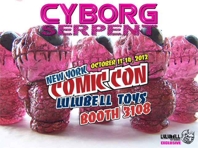 Continuing the slew of reveals over at the Velocitron x Lulubell Toys blog, the guys have revealed their first resin NYCC exclusive, the Cyborg Serpents from rustedhalo! Cast in a clear sparkling resin, the sweet little figures have been hand finished by the artist with a black wash. Limited to just 10 pieces, the Cyborg Serpents will be available at the Velocitron x Lulubell booth (#3108) for just $25 a piece. Head over to rustedhalo’s blog here for a closer look at the bug-eyed space creatures, and be sure to stay tuned for more from this promising artist soon!