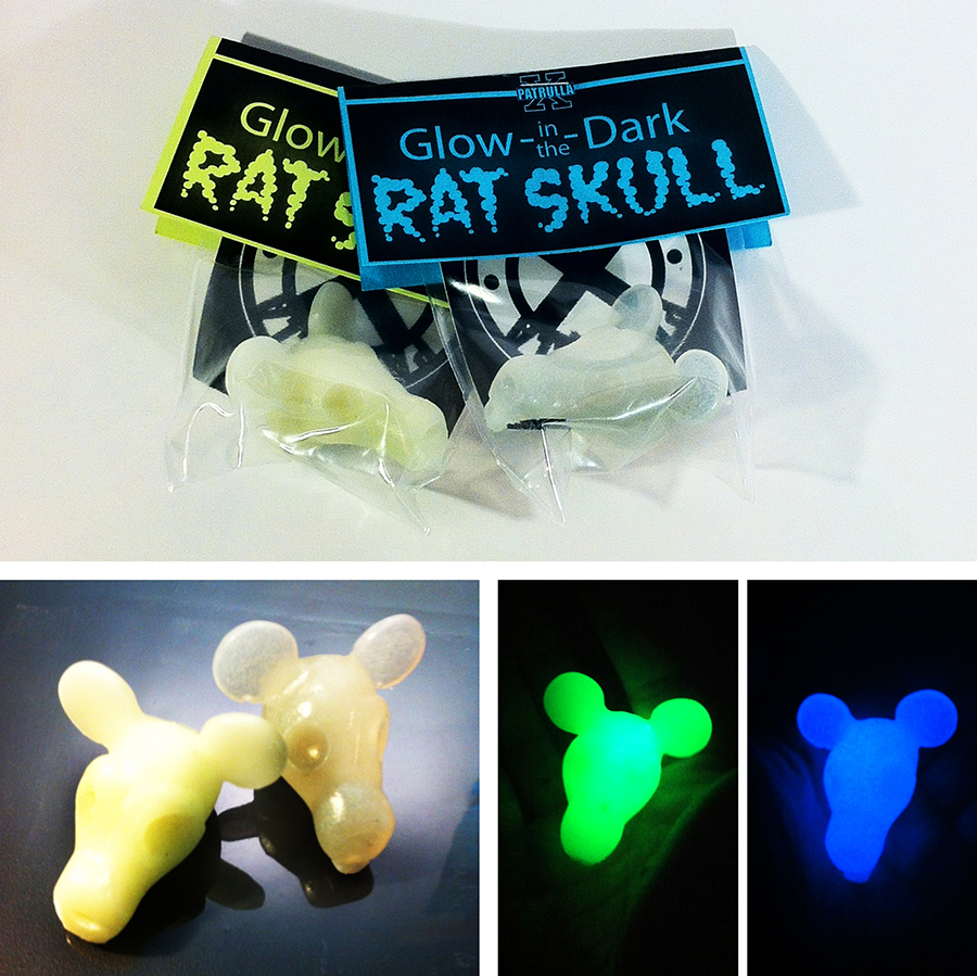 Originally featured here a month ago today, it comes with great pleasure today to reveal that Manny X‘s GITD Rat Skulls will finally be available next week! Hand cast in 2 choices of vibrant glow in the dark tints, either blinding green or electric blue, each skull comes bagged and carded with free stickers… Following the success of both Absynthe and Glitter editions, Manny has decided to release these guys as an “open edition”, the catch being that they’ll only be available for 4 days! Starting Monday, September 10th up until September 13th, the little guys (2″x 1″) will be in the Patrullax store for just $13 plus shipping…
