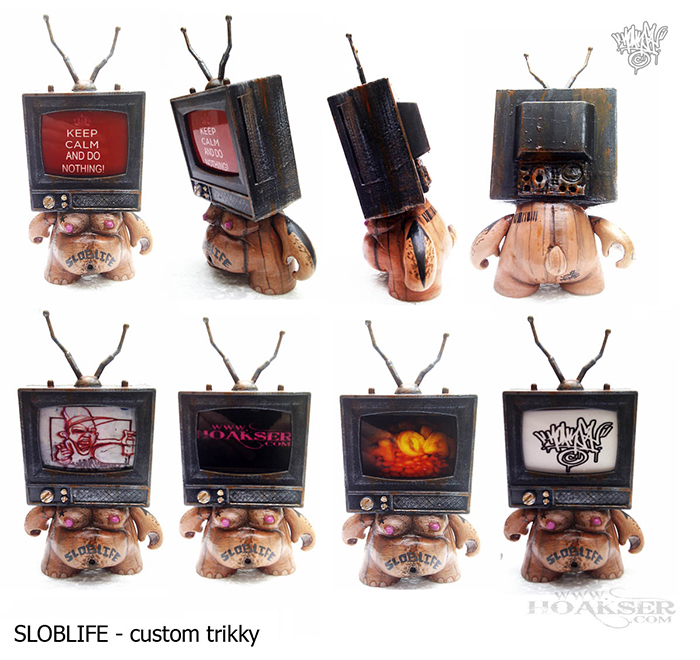 UK based graffiti artist Hoakser has been a little quite of late on the toy front, so it came with great pleasure yesterday to see that he’s returned on fine form with his latest piece, “Sloblife” the custom Trikky. Kit-bashed and modified from an old Simpsons toy T.V, Hoakser has let rip with his signature blend of sculpting and melting to produce THE ultimate slob! Featuring a wonderfully grimey paint style, “Sloblife”, “Love” and “Your Name” tattoos, and a fine set of man boobs, Sloblife easily ranks as one of our favourite customs from the artist yet… but that’s not all! Hoakser has ingeniously modified the T.V so that different prints (channels) can be inserted! Sloblife comes with 4 of Hoakser’s designs ready to go, plus a blank one for the lucky purchaser to custom themselves. Priced at just £55 plus shipping, the 14.5cm tall figure landed in the Hoakser store yesterday… so be sure to act quick if you want him in your collection!