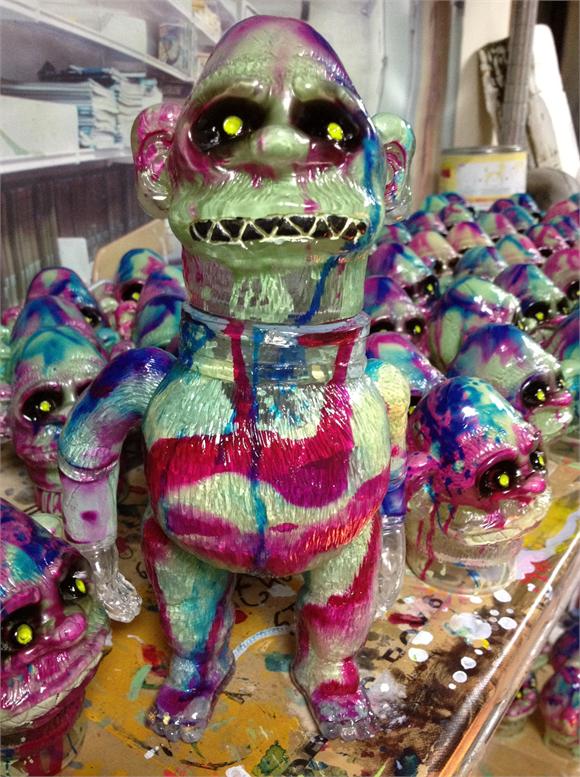 In a collaboration with Lulubell Toys, Grody will be dropping several Anti-Valentines releases throughout today (February 15th), including the long awaited ‘Spilled Paint’ Ensorcelled Man. Featuring a marvellous inside-out paint job (clear vinyl painted on the inside!), the army of zombie monkey men will be available for $50 each plus shipping.