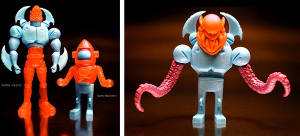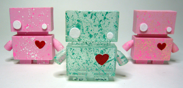 First up come the Love Heart Jellybots. Limited to an edition of 3, these hand cast and painted resin figures will be available in either solid pink, or clear flecked green. No news on pricing, but be sure to keep an eye on Briggs’ store today, as these guys will fly!