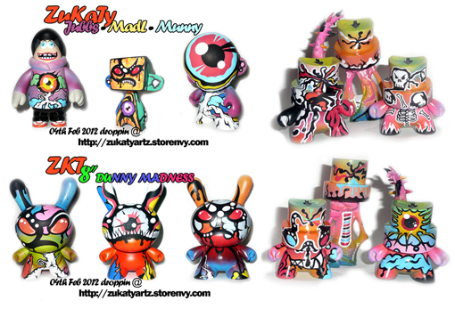 UK based artist Zukaty has been busy prepping his latest batch of customs for release this Saturday, February 4th. The fantastic collection is set to feature 3 8″ Dunny’s, a 7″ Munny, a 5″ MAD*L, and a Jubbs (expect prices between $40 and $160), all lovingly sprayed and brushed in Zukaty’s big, bold and brash style. In preparation for the big launch this weekend, 6 Fatcaps have been released on the store early, priced at $40 each plus shipping.
