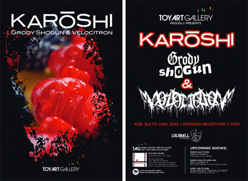 Press: Toy Art Gallery is proud to present “Karoushi”, featuring the works of Grody Shogun and Velocitron! “Karoushi” is the Japanese concept of death by overwork. Working simultaneously as brand, producer and retailer, the two masterminds of the Japanese soft vinyl producing powerhouse The Fort have banded together to unleash a gallery show of epic proportions. Multiple editions, one-offs and collaborative pieces are just the beginning of what these two have crafted for this event. Grody Shogun and Velocitron hope that attendees to the gallery show can get a taste of just what two people can accomplish when they decide that their own health, sanity and overall well-being rank far below achieving their dreams of revolutionizing the Japanese vinyl world.