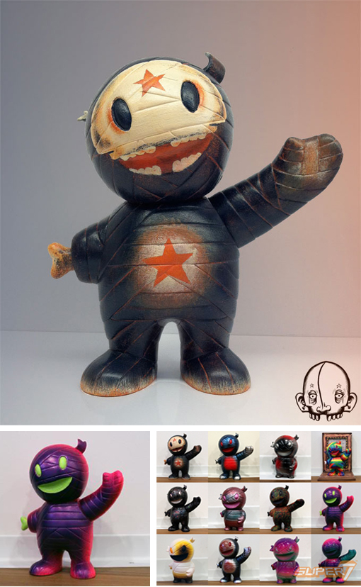 Held last weekend, Super7’s Mummy Mania! show featured over 40 Mummy Boy customs from some of the neo-kaiju scene’s biggest talents, including Mummy Boy sculptor Brian Flynn, Leecifer, Blurble, Paul Kaiju and Nebulon 5. All of the customs are now available to purchase through the Super7 store, with prices ranging between $55-$600. Our personal favourite is Rik Sans‘ neon-hued effort (pictured below left), the colours are quite simply out of this world- I have to say I’ve fallen in love with the pink to purple spray, but it’s that tight green detailing that really helps to make this Mummy pop. Where’s a spare $250 when you need it?!