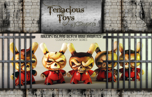 The latest 3″ custom Dunny series from JC Rivera dropped this week in the form of the ‘Riker’s Island Death Row Inmates’. Limited to an edition of just 5, the hand sculpted and painted thugs are available to purchase at Tenacious Toys, priced between $40 and $75 (plus shipping) depending on the level of modification.