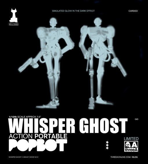 Alongside the standard edition Popbot’s, Bambaland will also be releasing limited supplies of the exclusive Whisper Ghost GID Popbot. Also available as single carded figures and a 4Way box set, 3AA members will be given priority for the first 24 hours, at which point the toys will be made available to the public through the Bambaland store. Pricing hasn’t been confirmed, but we’re guessing the GID Action Portables will retail close to the standard editions.
