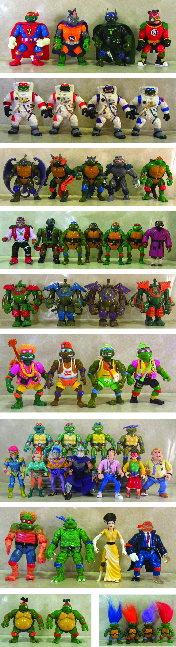 Whilst the likes of Kenner were happy to re-paint old figure designs and pass them off as new, Playmates were not content on resting on their laurels. With four successful TMNT series under their belt, including various other merchandise, the company set about working on several new and increasingly creative lines. With the help of the various other licences they had accumulated since the start of the Turtles’ success (including both Star Trek and Universal Studios), Playmates set about reinventing the turtles and their foes in the role of monsters, cowboys, sport stars, astronauts, sumo wrestlers and even lucky trolls, drawing from every last pop culture reference they could think of- a trend that has had a massive impact on the contemporary art toy scene.