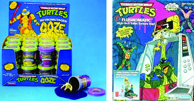 By far the most popular accessory in the line came in the form of the Retromutagen ooze. One of the most famous components of the TMNT realm, this was the radioactive slime that mutated the Ninja Turtles from common house pets to “mean, green, fightin’ machines.” The green slime was sold in a small container which also included a glow-in-the-dark Ninja Turtle in mid-mutation. Aside from the classic “Turtle Green,” a “Purple Foot” variation would also become available in 1993. Ooze was an essential component to playsets such as the Flushomatic, and action figures like Muckman, who could have it run through a reservoir in his head and out his mouth. Depending on their features, occasional figures and accessories came with their own smaller canister of Ooze to fulfill the playtime experience.